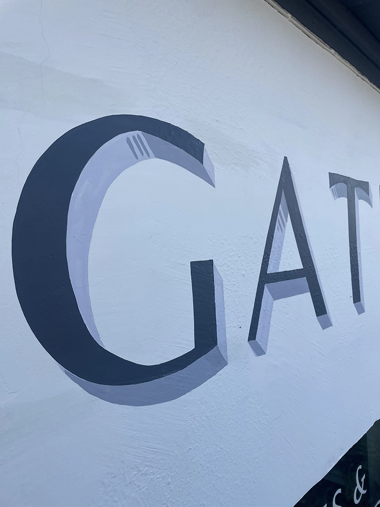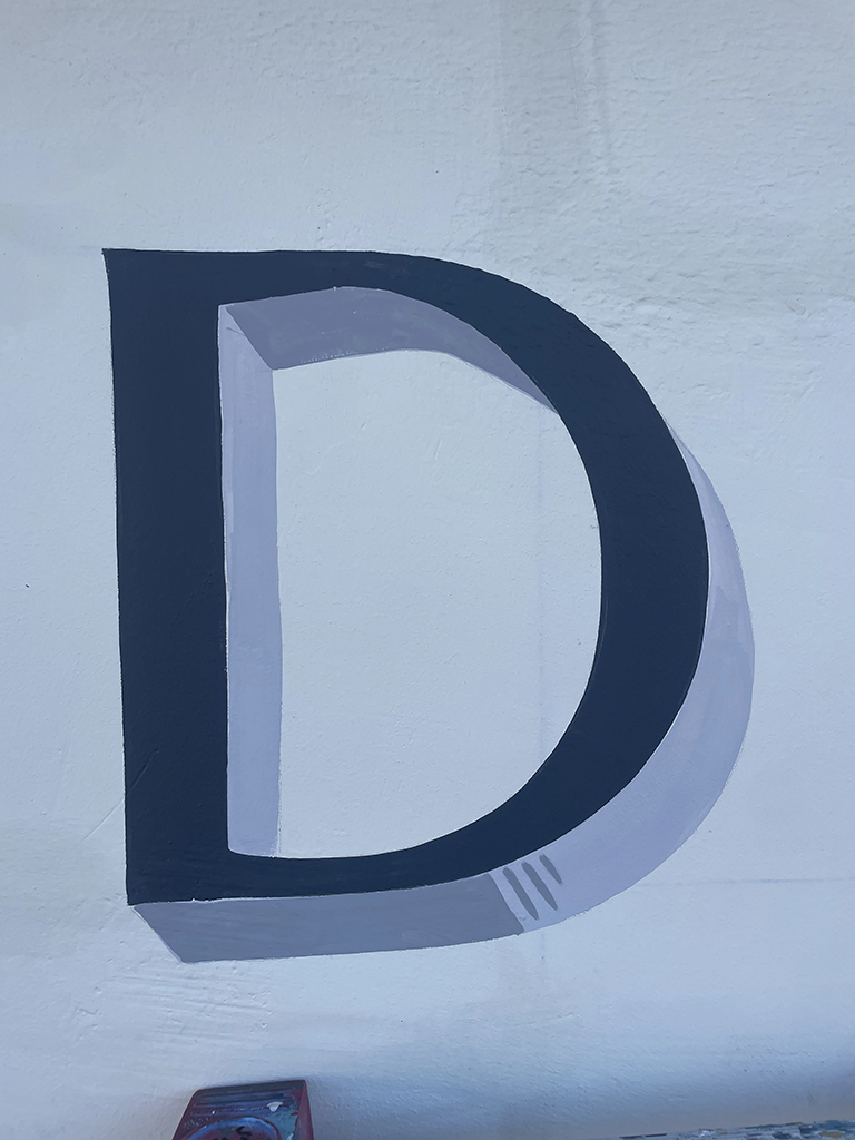 Les lettres ont été dessinées et peintes directement sur la façade, sans éléments rapportés, afin de préserver la lecture architecturale du bâtiment. Le choix de la lettre peinte permet une intégration fine, durable et respectueuse du bâti ancien.